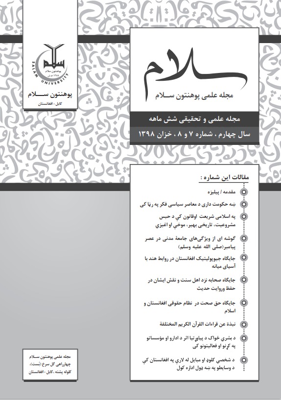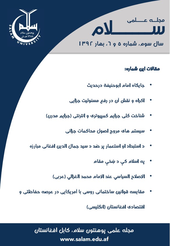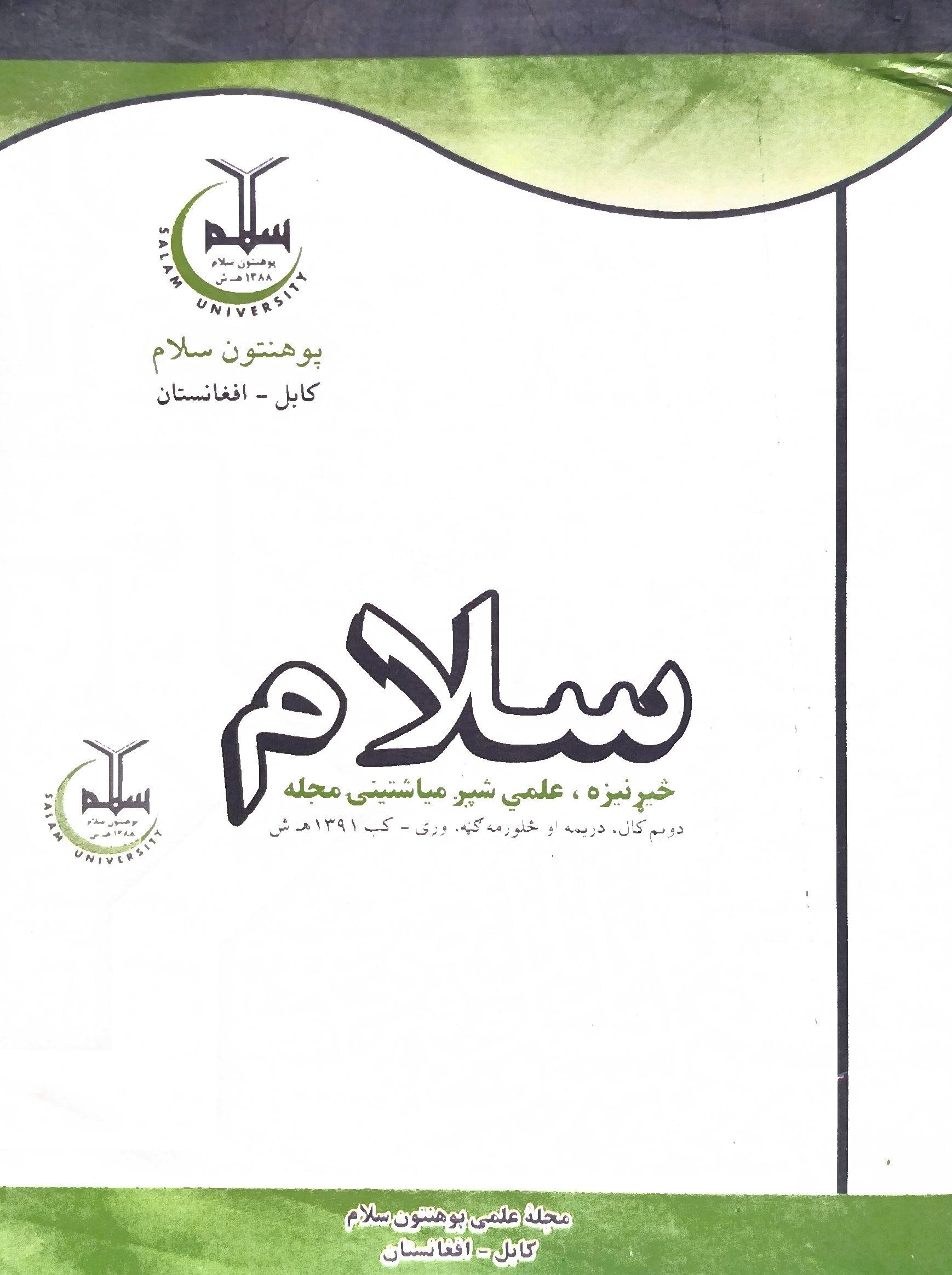 دوره 1 شماره 1 (2011)فیصلۀ تأسیس ژورنال علمی سلام به عنوان یک مجلۀ تحقیقی شش ماهی، در خزان 1389 ه ش طی نشستی در ادارۀ علیای پوهنتون سلام صورت گرفت. اولین شمارۀ سلام در بهار 1390ه ش، در 162 صفحه به قطع وزیری، به نشر رسید. سردبیر مجله پوهندوی شفیق الله امین، و مدیر تحریر آن؛ پوهنوال دکتور مصباح الله عبدالباقی؛ هردو از استادان پوهنتون سلام و دارای مدارک علمی بالا بودند. علاوتاً هشت تن از متخصصین علوم مختلف، از داخل و بیرون پوهنتون سلام، عضویت هیئت تحریر آنرا داشتند. اولین شمارۀ سلام، حاوی یک مقدمه، و شش مقالۀ علمی به زبان های پشتو، دری و عربی بود که در جامعۀ علمی آنوقت افغانستان مورد استقبال گرم قرار گرفت. از شمارۀ دوم به بعد، مقالات به زبان انگلیسی نیز به مقالات سلام افزوده شد. اعتبار علمی و دست آوردها: ادارۀ مجله از وقت تأسیس، کار رسمیت آنرا نیر روی دست گرفت، اما به بخاطر وجود بعض قوانین سخت گیرانه و غیر واقعی، این کار به تأخیر افتاد. تا اینکه با تکمیل تمام شرائط و مقررات، مجلۀ علمی سلام به تاریخ 18 جوزای 1401ه ش، سند اعتبار علمی خویش را از وزارت تحصیلات عالی افغانستان به دست آورده و از آن تاریخ به بعد، مقالات چاپ شده، دارای اعتبار رسمی بوده و باعث ارتقای علمی نویسنده گان خود نیز می گردد. از زمان تأسیس تا حال، 15 شمارۀ ژورنال علمی سلام، در 11 مجلد به نشر رسیده و تعداد مجموعی مقالات چاپ شده به 75 مقاله میرسد. علاوه بر مقالات دیگر، افتتاحیۀ مجلۀ علمی سلام، دارای اهمیت خاصی بوده، موضوعات استراتیژیک و سرنوشت ساز افغانستان را مورد بحث قرار می دهد و ضمن آن، پیشنهادات پالیسی سازی را در رابطه با قضایای مهم کشور، برای اولیای امور و پالیسی سازان تقدیم می دارد.